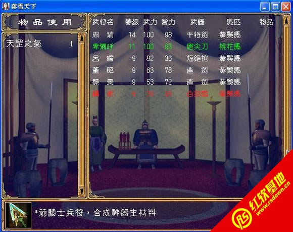 通过“搜索”指令可以找到武将,更多的是找到诸如武器、马匹、兵符和特殊物品。搜索到的物品和战斗时缴获的战利品可以通过“使用物品”分配给所需武将,用于提高武将的能力或忠诚度。也有一些物品需要武将的等级或是能力达到一定的要求才能使用。nnl本站