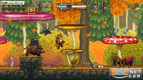 《狐狸森林(FOX n FORESTS)》是一款横版像素闯关类型游戏,有些类似于我们曾经玩的FC游戏风格,较为复古。玩家将会扮演一只拿着十字弩的狐狸,为保卫自己的家园而与入侵者们战斗。